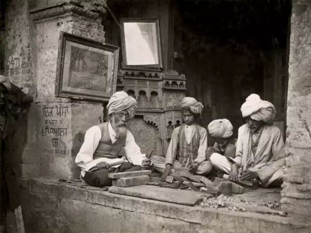 1921年7月,印度北部城市阿姆利则,工作中的木雕艺人。
