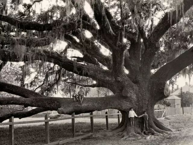 1930年,美国路易斯安那州,孩子们在一棵巨大橡树上玩耍。Edwin Wisherd/摄。