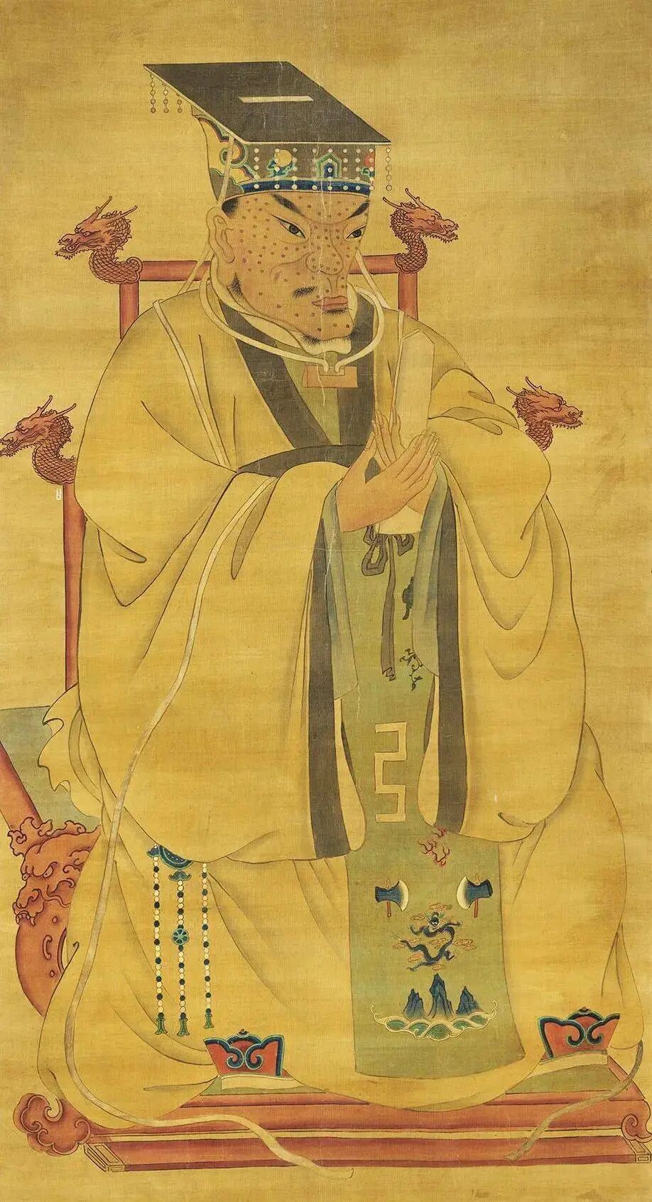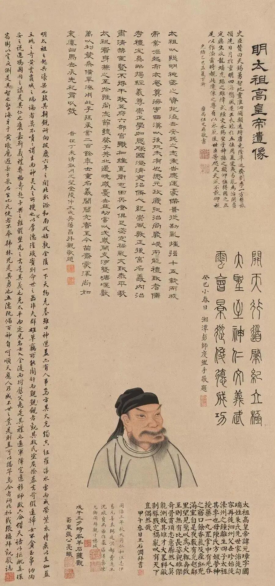 当然,也有人从服饰的角度出发,认为是清朝丑化朱元璋。还有人从医学角度考证,认为朱元璋丑陋是因为患有“肢端肥大症”。此处不讨论画像的真伪,且将其看作是图像史的一种特例,也算是“志怪”图像之一种。今汇集海内外馆藏中的彩绘朱元璋像,以便集中观察。