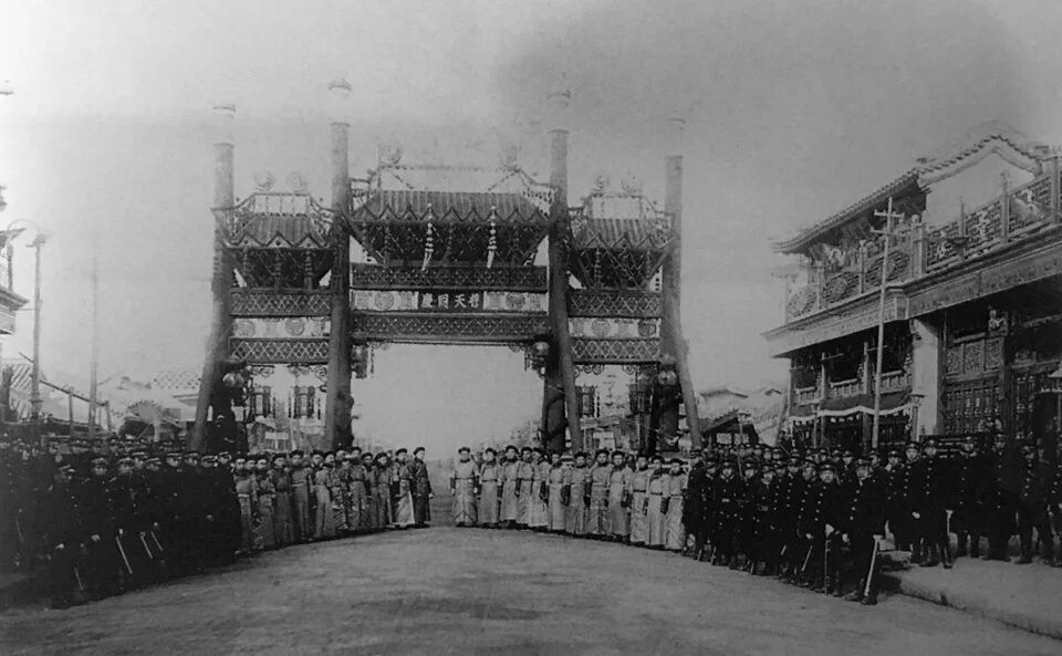 照片为1908年12月12日宣统帝溥仪登基大典之中,京城巡警部在溥仪登基当天庆祝溥仪登基。