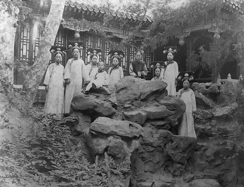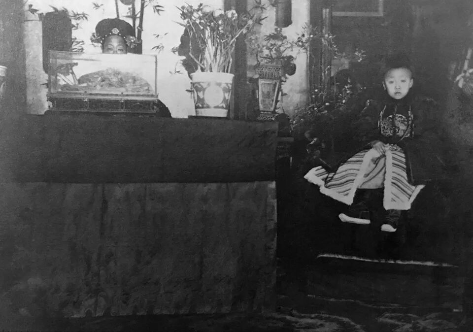 照片为1908年进入皇宫等待登基的溥仪,他由隆裕太后照顾,居住在建福宫苑之中。