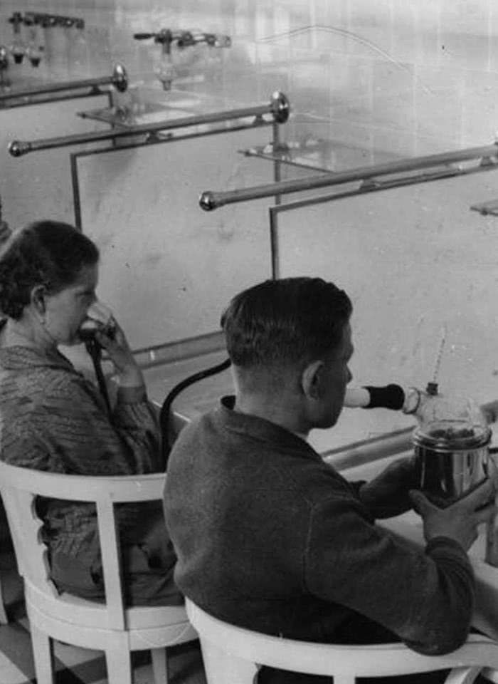 1930年,德国一间医院中,病人们正在吸入薄荷脑和桉树粉等药物,治疗呼吸系统疾病。