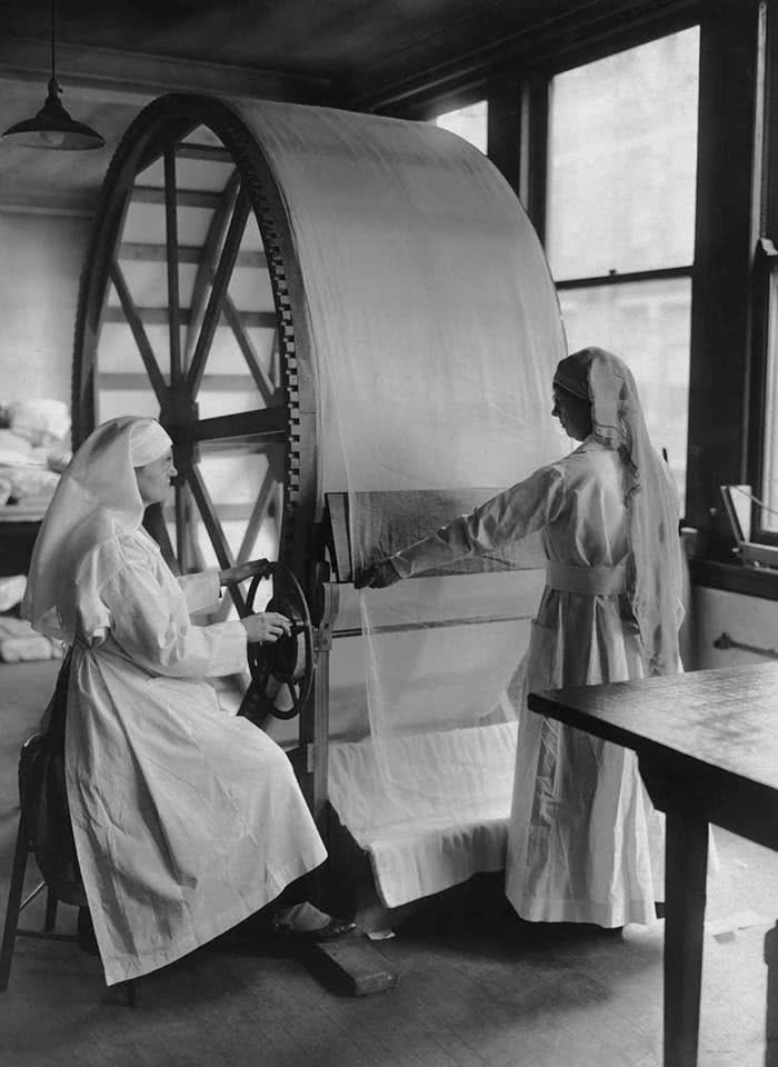 1915年,俄亥俄州辛辛那提的红十字会总部,妇女使用新的拉伸机进行手术敷料。