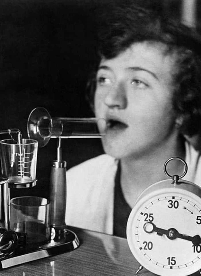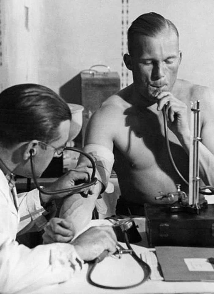 1932年,Radtke中尉用水银柱将空气压入恒定的高度,医生检查他的血压。