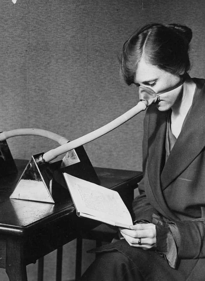 1929年,一名女子正在使用电子呼吸仪器治疗感冒。