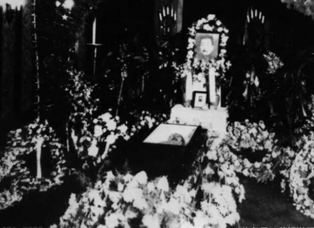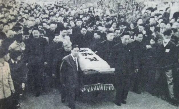 鲁迅先生的棺椁到达墓地,盖在棺椁上的是沈钧儒写的“民族魂”锦旗;巴金、宋先生、茅盾、许广平等11人扶灵。