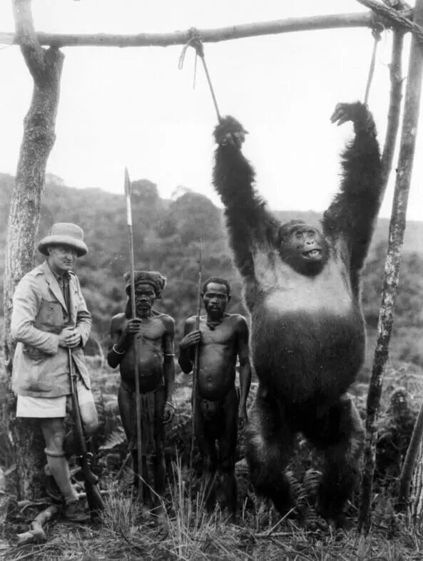 1930年在比利时刚果,这个男子和两名当地人在展示他们猎捕的大猩猩。