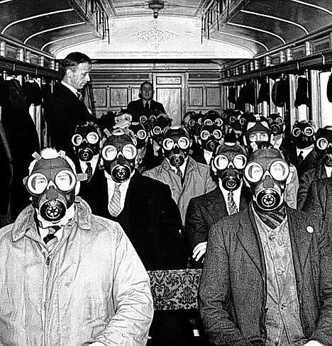 1940年在英国伦敦,乘客每天乘坐火车时都戴着防毒面具。