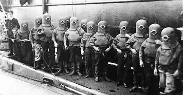 1908年,德国潜艇船员的潜水员准备到水下进行训练。