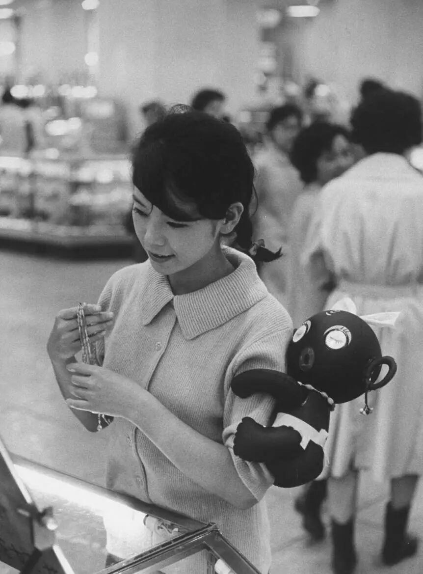 1960年这位日本女孩在手臂上挂着一个玩具,这在当年是一种时髦。