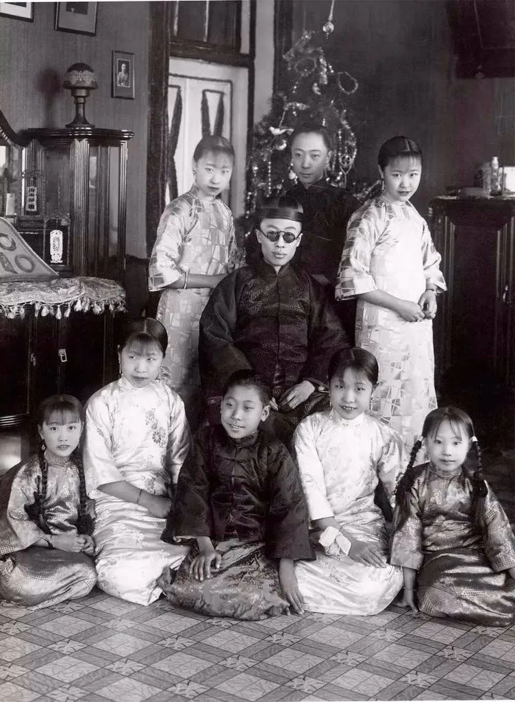 穿着传统服装留着辫子的中国男人在聚餐,这是1920年中国上海一张明信片上的画面。