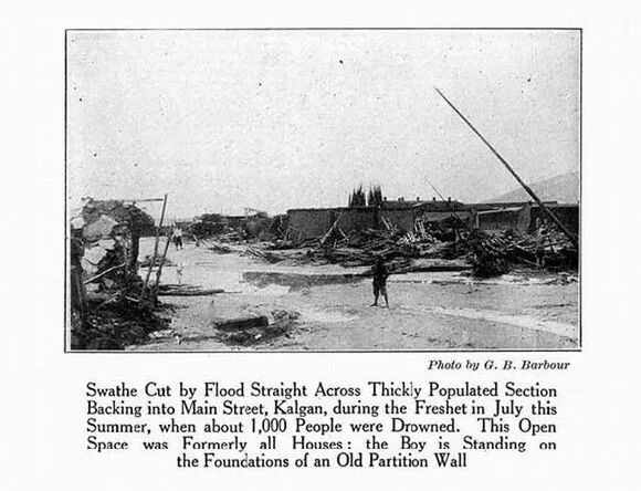 1924年农历六月十三,张家口遭逢了一场有史以来特大暴雨灾难。洪水流量达2590立方米/秒, 整座城市淹没在浩荡的洪水中, 三百余年的石桥被冲毁,房屋冲毁倒塌万余间,城内及郊区死亡人数近3000人。洪水退后,满目狼藉,沉沙污泥高及屋顶。灾后百姓生计断绝, 背井离乡四处逃难。