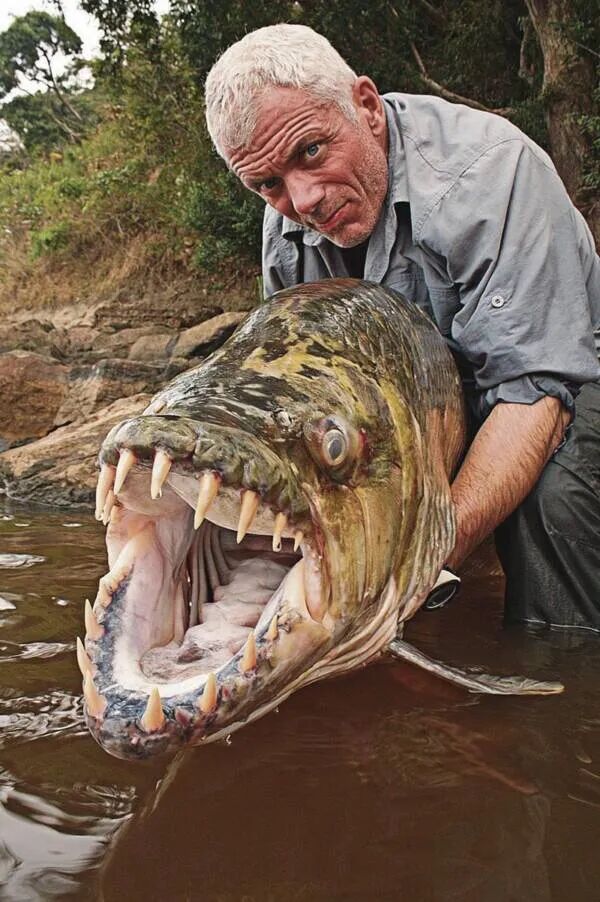 杰里米·韦德(Jeremy Wade)花了三十年,满世界寻找这种最为奇怪的淡水鱼。图中的英国电视台节目主持人正抱着一条刚果河虎鱼,韦德说它“能长到和人一样大小”。更恐怖的是,这种生物的嘴里长满了长约2.5厘米的牙齿,和重约453.5千克的大白鲨的牙齿差不多大小。