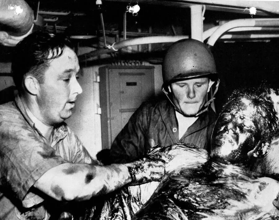 在印第安纳波利斯号巡洋舰秘密运送原子弹零部件(即那枚将落在广岛的原子弹)的几天后,它遭到了日军潜艇的袭击。1945年7月30日,袭击使得近1000人漂于菲律宾海,该舰的燃油将他们烧死,鲨鱼用他们果腹。图中是316位幸存海员之一。