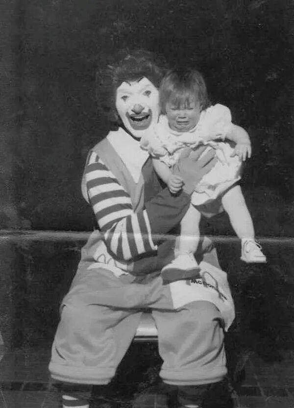 很多人特别害怕小丑,图中被麦当劳叔叔抱住的小朋友为何一脸苦相则不言而明。不过图中的麦当劳叔叔并非1963年的原装版本,这个吓人的版本源于20世纪70年代——他的眼睛看起来更像动物,而非人类。