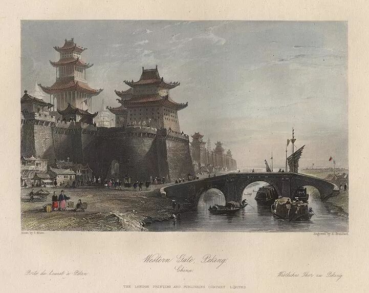 前言已经提到《大清帝国城市印象》作于鸦片战争刚结束后的1843年,当时殖民侵略还没有完全展开,对于欧洲人来说中国仍然是世界唯一的超级大国,西方文人对中国的人文理想仍然存,这种情况下创作的《印象》当然看不到过多的妖魔化的影子,反而一定程度上反映了西方人对中国理想国度的向往。《印象》可以帮助当代人很好地了解西方的"东方画家"到底在中国画了些什么?十八、十九世纪西方人是如何看待"大清帝国"的?中国在欧洲人心目中是怎样的一种形象。第一次发现中国的建筑也这么宏伟漂亮,比之西方有过之而无不及! 西直门外18世纪末到过北京的英国人都还承认:北京是世界上最大的城市。1793年,马嘎尔尼使团到达中国,他们获悉北京人口数是300万,光是都城(鞑靼城)就有14平方英里,紫禁城面积也超过了1平方英里,比当时刚刚扩建的伦敦城还要大三分之一,是18世纪世界最大城市,伦敦的城市规模,无法和北京相比。清代北京城的西面,共有阜成门、西直门、西便门、广安门四座西门,西直门处于西北,马嘎尔尼一行的使节们经此门到圆明园。北京城墙拆光了,西洋画的笔触,写实的风格供我们遥想当年。城门有些失真,不该高耸如宝塔。资料说威廉-亚历山大是1799年在英国完成这幅画的,可能是丢了素描稿,凭印象画的。他把中国的建筑夸大得高大以符合英国人的想象。这幅水彩画的原作收藏在大英博物馆。清代的北京,仍然是一个水源比较充沛的城市。玉泉河自西注入护城河,贯通城内宫中的积水潭、北海、中海、南海。当时的北京虽不象南京、扬州、苏杭等江南城市般“秦淮风月”,但不致如日后干枯得河底朝天,偶尔也能看见城下扬帆飘动,舟楫往返。