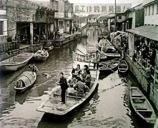 1985年,浙江绍兴计划生育宣传队乘船沿河演出。