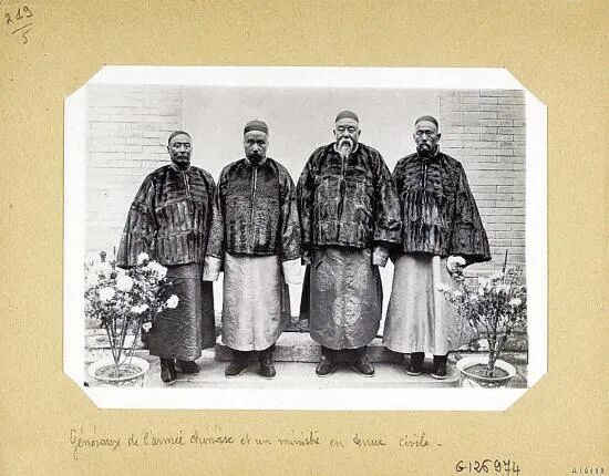 清朝大臣,左二为邮传部尚书徐世昌(后成为民国第三任总统),左三为直隶提督姜桂题