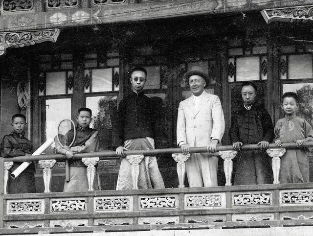 溥仪一众人等打完球去故宫御花园游玩,照片拍摄于御花园阁楼二层。左边两个小太监,一个拿球拍一个捧球筒。中间戴墨镜的是溥仪,右一是婉容的弟弟润麒,右二溥杰,右三是溥仪的洋老师庄士敦。