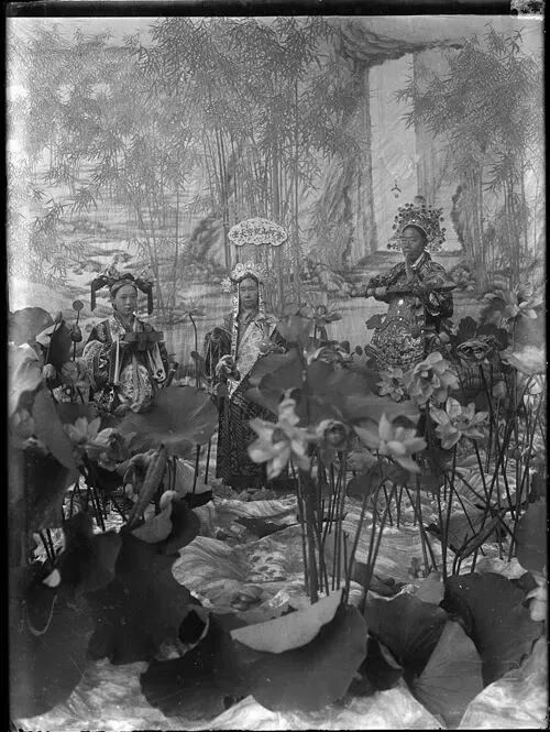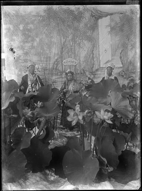 老佛爷的“观音范”,左侧的“龙女”是德龄,右侧的“护法”是李莲英