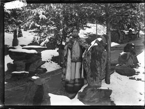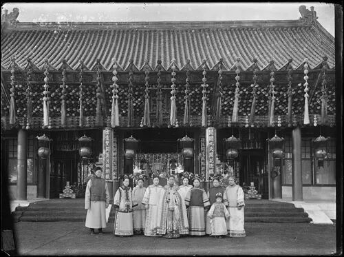 颐和园排云门外,左起崔玉贵,隆裕皇后,俊寿,德龄公主,慈禧,容龄,四格格,元大奶奶,莉莉(勋龄的女儿),裕庚夫人。元大奶奶是内务府大臣庆善之女,被指婚给慈禧弟弟桂祥之子,还没过门男方就死了,但是已经换了庚贴,只能成为望门寡。莉莉是中法混血。