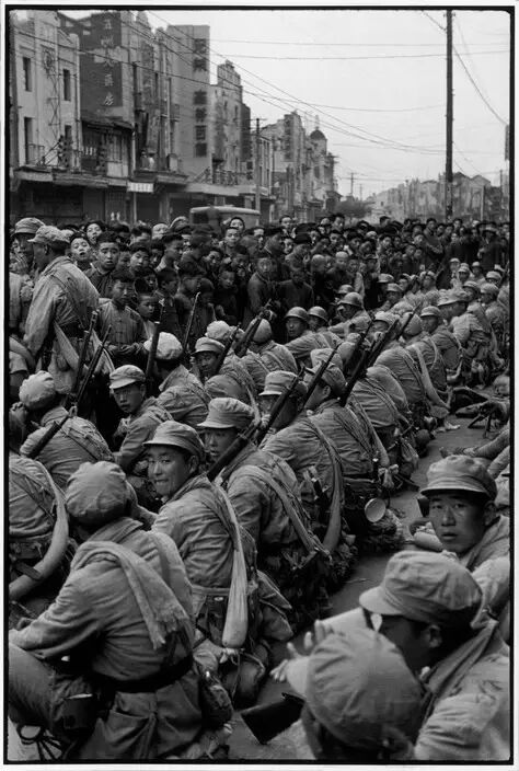第一批到达的解放军,对面是好奇的人民群众,南京。1949年4月