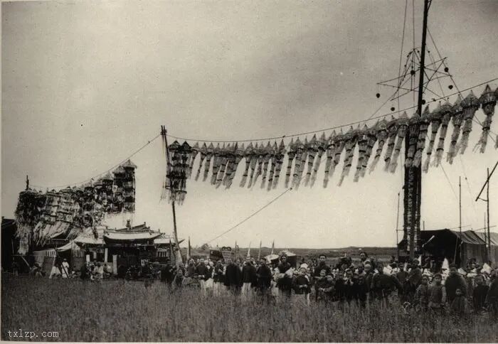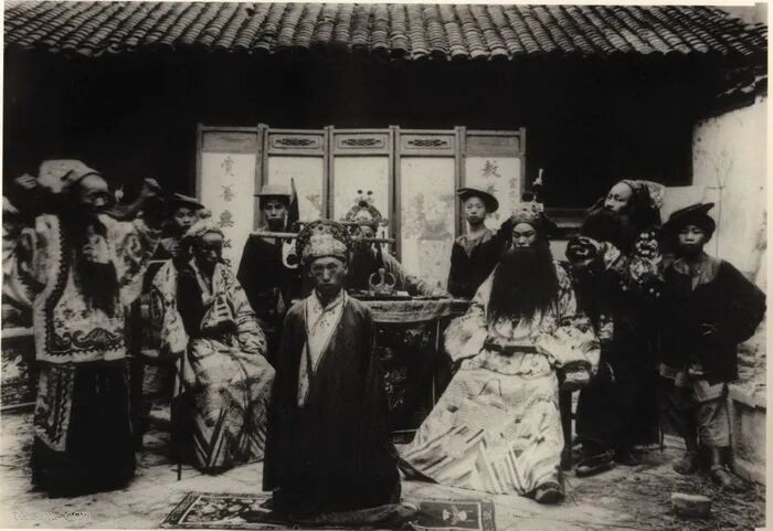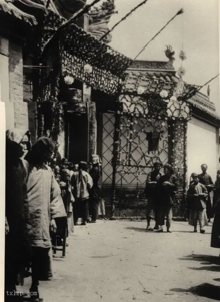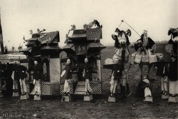 68、纸扎的动物、仆人、妻妾、房屋及银库等祭品,会在丧礼中焚烧,以供亡灵在阴间享用。1904年拍摄的。