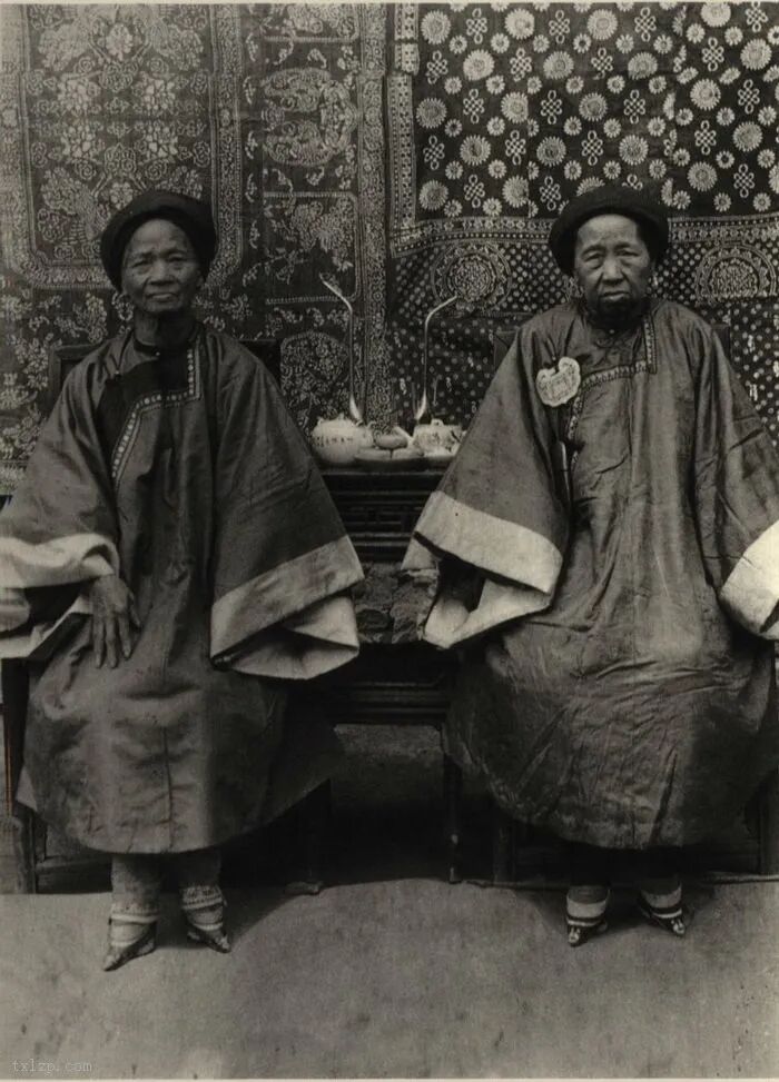 104、老妇合照,二人神情拘谨,同样是“三寸金莲”。