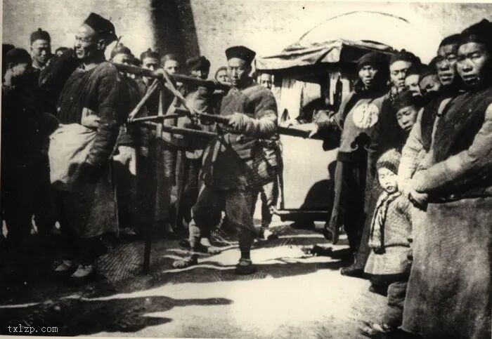 71、一名被控偷窥的年轻犯人,双手与辫子均被缚在木柱上。