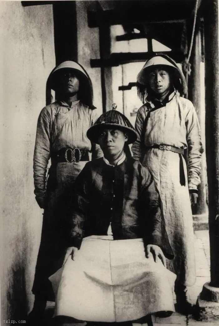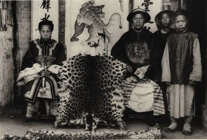 90、一名满清高级军官与其妻女合影。官服上的老虎图案及官帽上之顶珠标示其官位是四品。