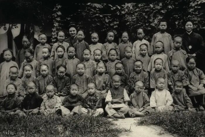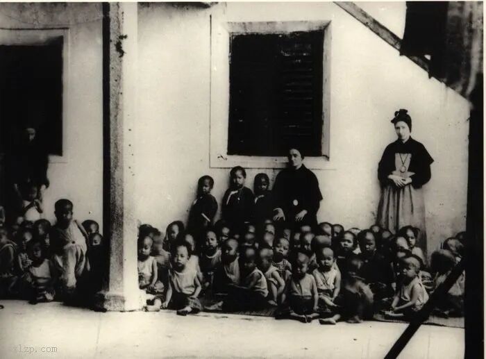 141、嘉诺撒会修女与一群孤儿及其乳母合影。女教徒头戴方巾。