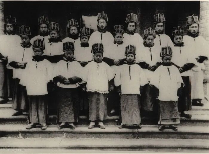 131、头戴祭巾的辅祭们。直至一九二四年,弥撒中的神职人员及辅祭均需头戴祭巾。