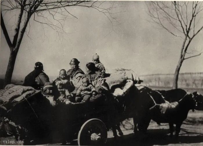61、一个家庭乘牛车远行,车上放满家具。