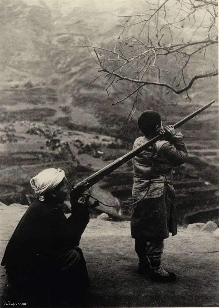 43、猎人在使用猎枪,由于枪管太长,必须由助手协助。