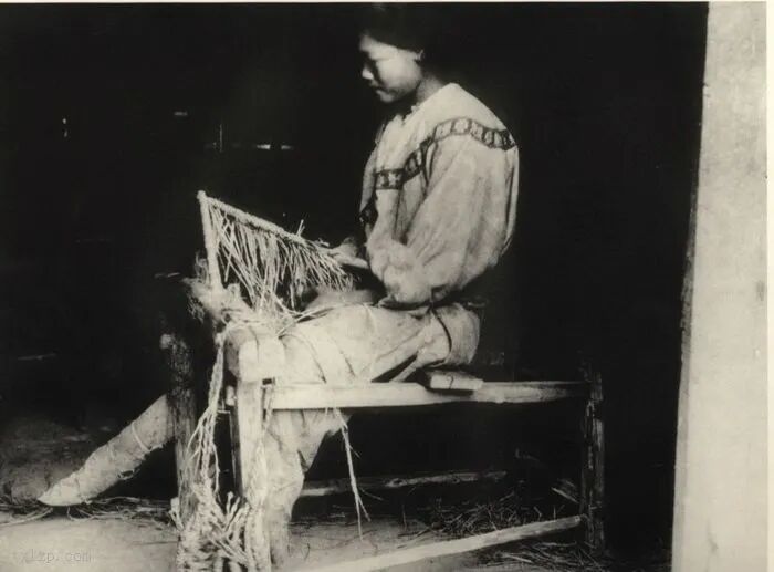 49、纺丝线:将蚕茧浸在开水中,经抽丝剥茧,把丝线在以脚踩动的纺纱机上。