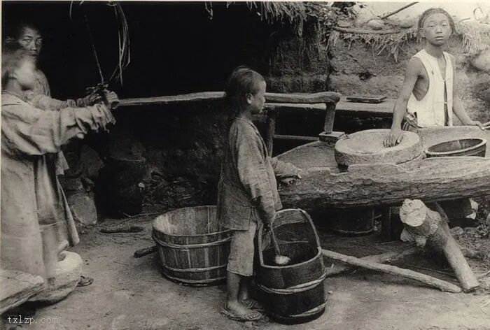 51、豆腐坊一景:三名小童手推石磨,把黄豆制成豆腐。