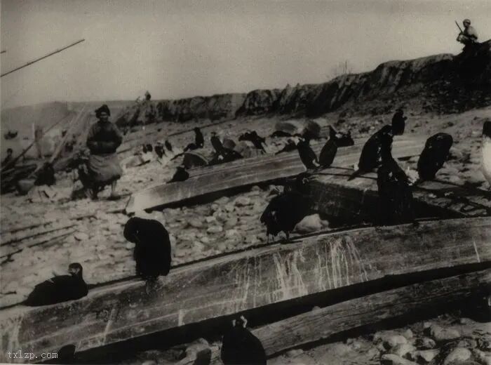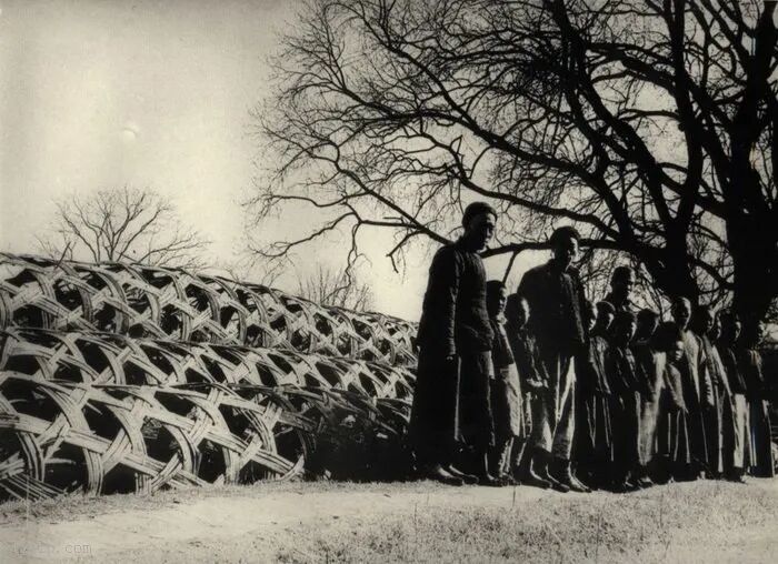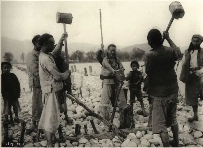 46、工人用灌满石头的竹笼来牢固河堤。