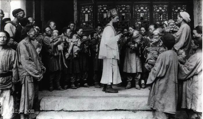 2、南怀谦神父为一群幼婴付洗。他行礼时头戴祭巾,这是神职人员在中国的弥撒中佩戴的特定帽饰,在华沿用至一九二四年。