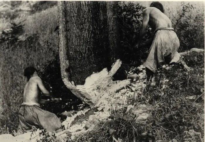 40、两名伐木工人以斧头砍伐大树。