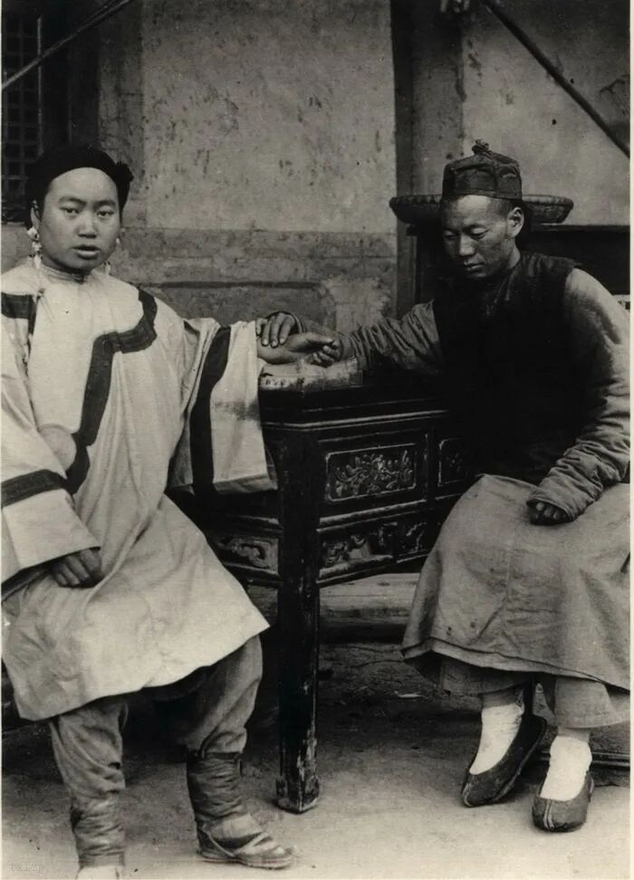 47、大夫正为女病人号脉。在当时,男大夫诊病接触女性手部为最极限之身体接触。