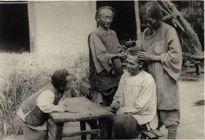 36、街头理发匠正仔细为顾客清除头虱 。