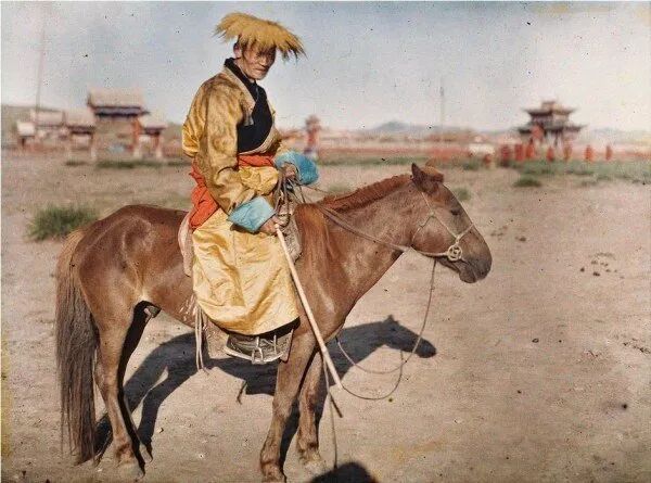 1913年,库伦“黄宫”附近,马背上的巴德玛多尔济(蒙古喇嘛、政界上层人士,曾任博克多格根的内阁总理)