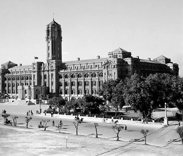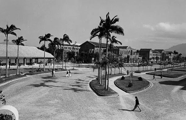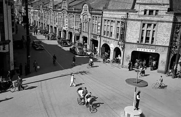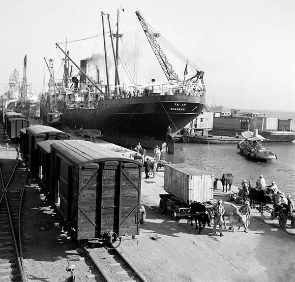 1950年,台湾,鸟瞰基隆港口,码头上工作的人。