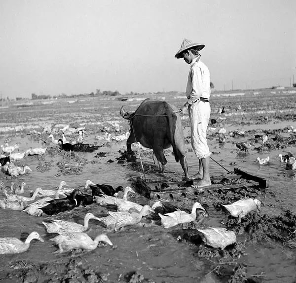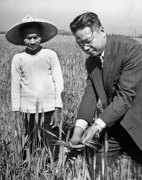 1950年,台湾,农民和农业专家研究小麦作物生长。