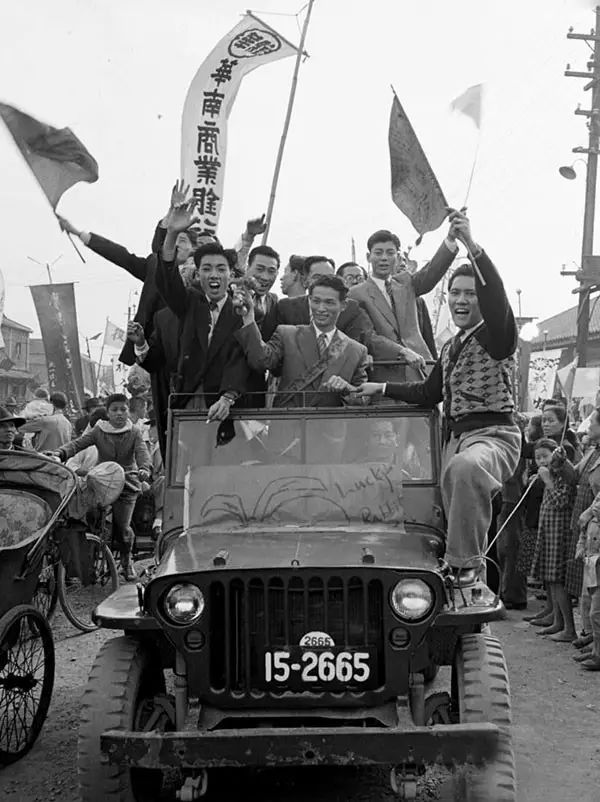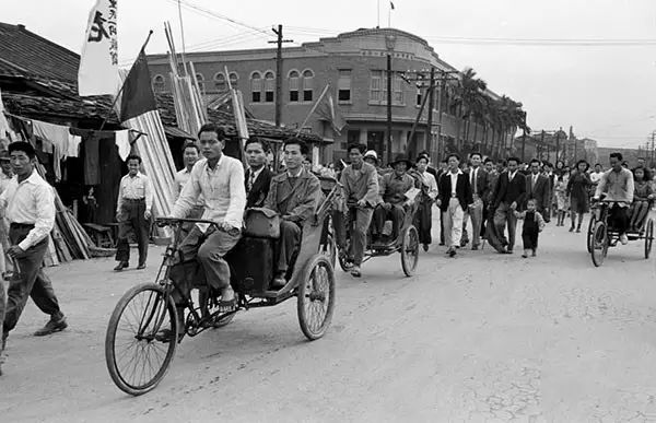 1950年,台湾,国军新兵应征入伍在街头宣传造势。