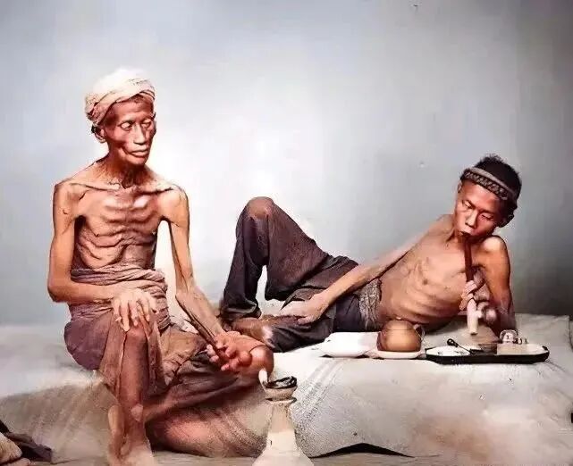 两个男子正在吸食鸦片。因为长期吸食鸦片,两人身体已经被掏空,瘦骨如柴。并且眼神呆滞。