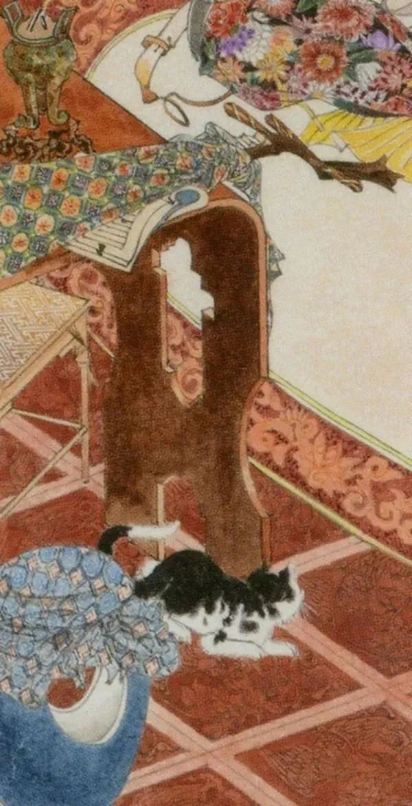 途中造型最美,用途又最高雅的就是琴桌。虽然只是露了一部分,那柔美的造型也窥见一斑,琴桌上还有一个仿古香炉。而琴桌下的喵星人不知正在好奇地看什么呢?