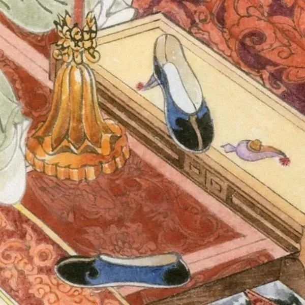 细致描绘了散落在床下的三寸金莲半高跟鞋。