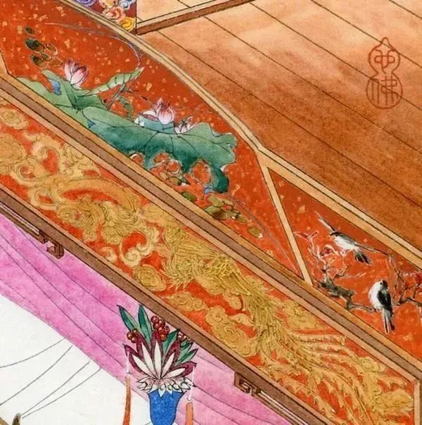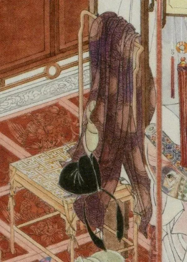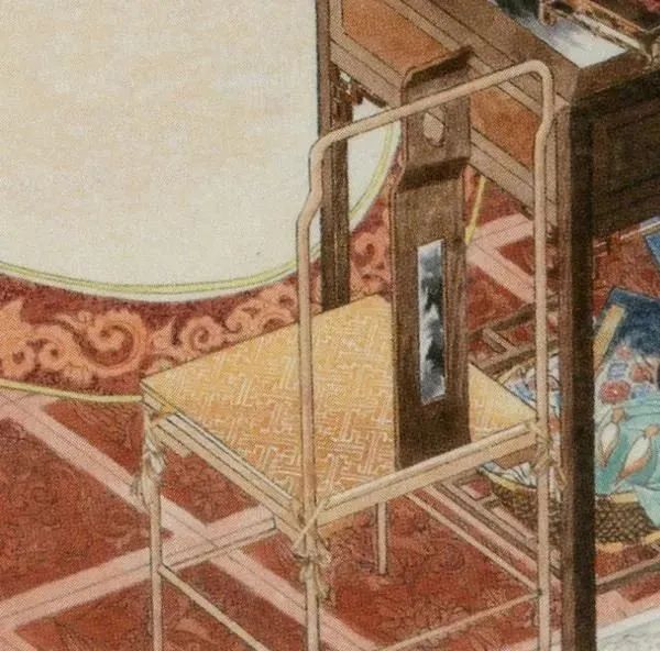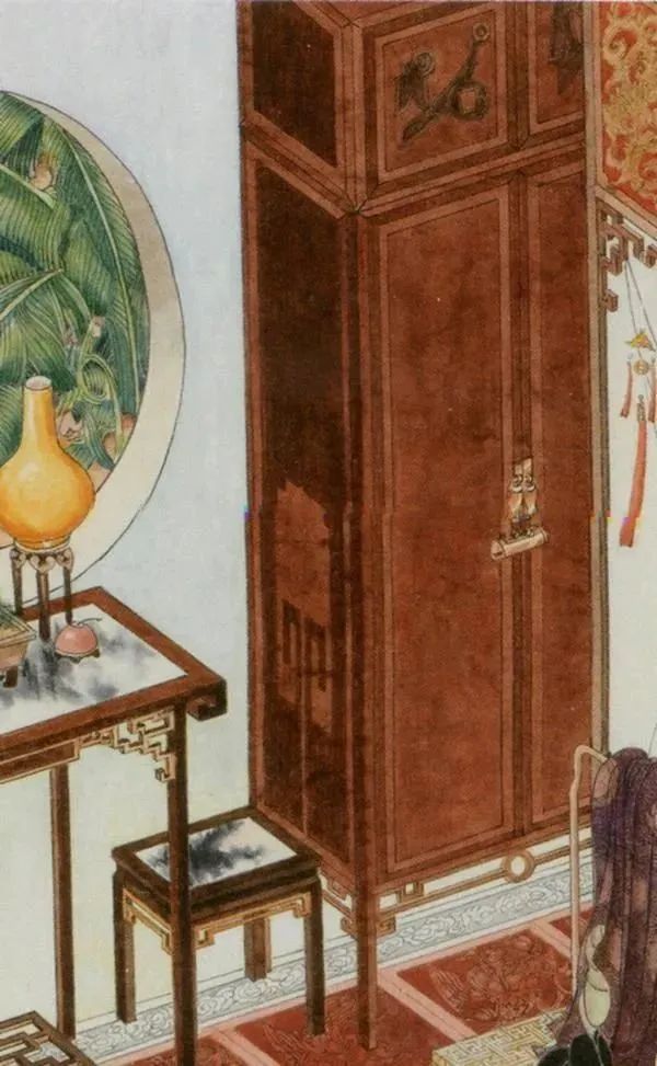 图中最重要的家具就是两个男女主角战斗的地方,学名架子床,又称拔步床,是古代富人家常用的寝具,明代最典型,用料讲究,做工精细。图中的床眉上彩绘三种图案:游龙戏凤,荷塘浮萍,双雀闹春。