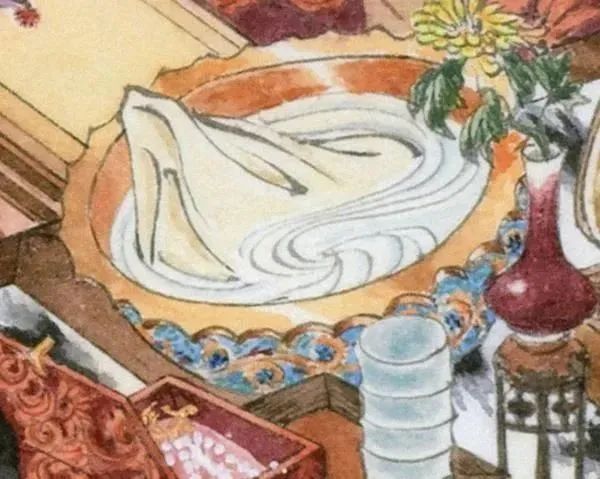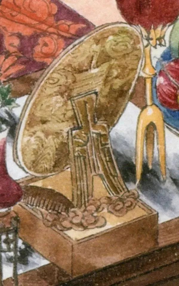 女人离不开镜子,图中的铜镜是典型的宋代制式,铜镜经过汉唐的高峰期转而重实用,不重装饰。注意旁边还有一只梳子和一个类似假发的装饰物。而洗脸用的“铜折沿珐琅彩葵口盆”算是最精致高贵的用具了。